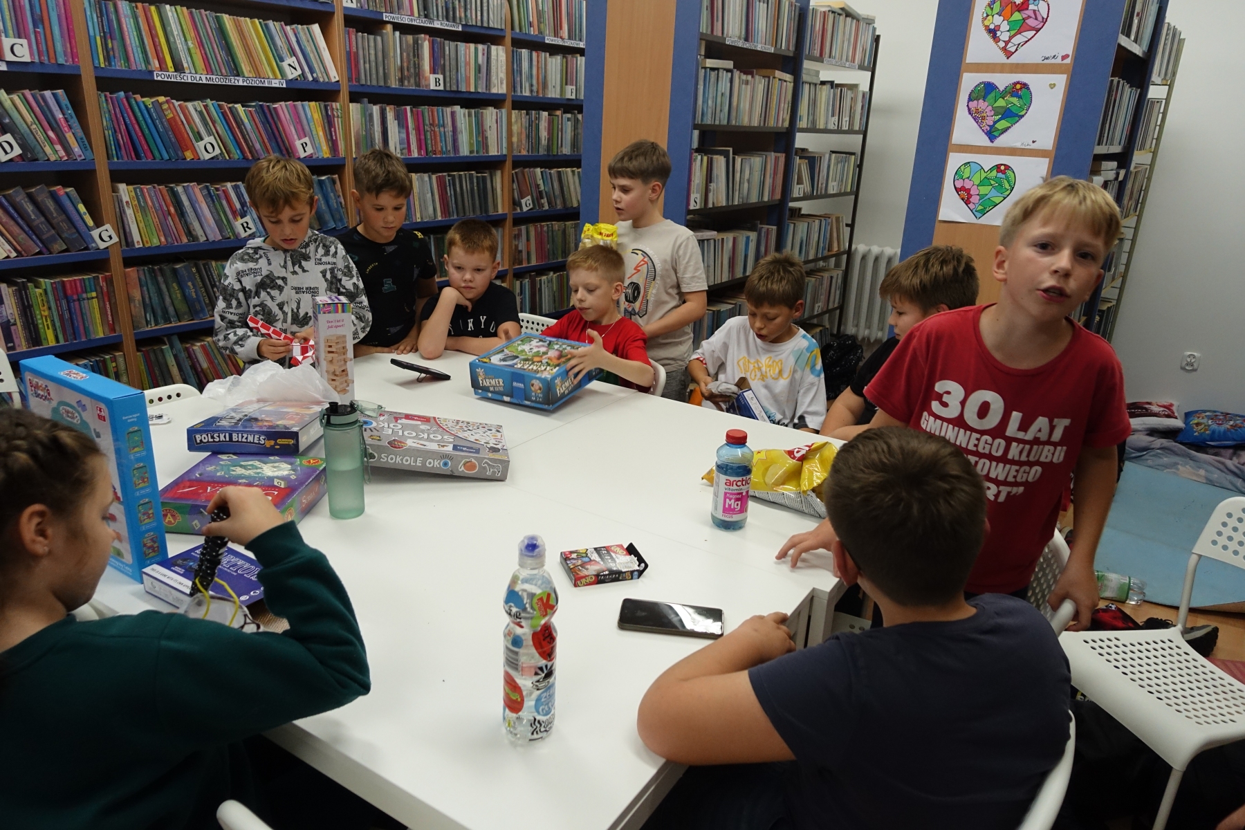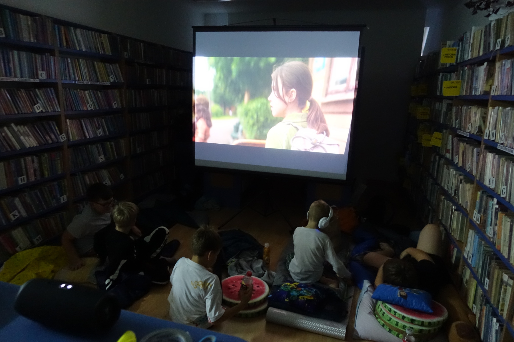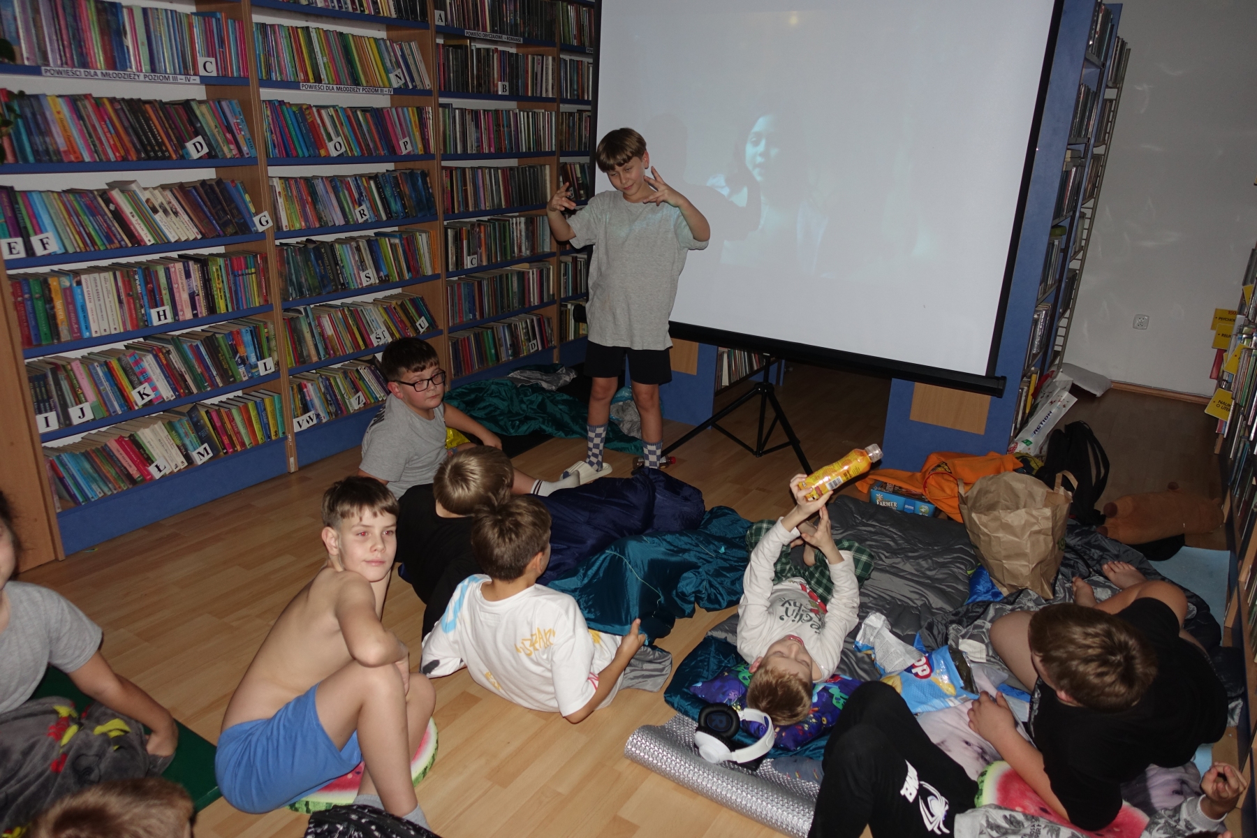W piątek o godzinie 20.00 rozpoczęliśmy „nocowanie w bibliotece”. Dzieciaki zjadły pizzę, rozmawiały. Było bardzo wesoło. Po kolacji był czas na gry i zabawy nie tylko „stolikowe”, ale i ruchowe – ponieważ grupa okazała się bardzo energiczna. Późnym wieczorem odbył się seans filmowy. Oglądaliśmy film pt. „Biuro Detektywistyczne Lassego i Mai. Rabuś z pociągu”. Po seansie dzieciaki nadal rozmawiały, wymyślały różne zabawy do późnej nocy. Był to bardzo mile spędzony czas, a noc pełna wrażeń.