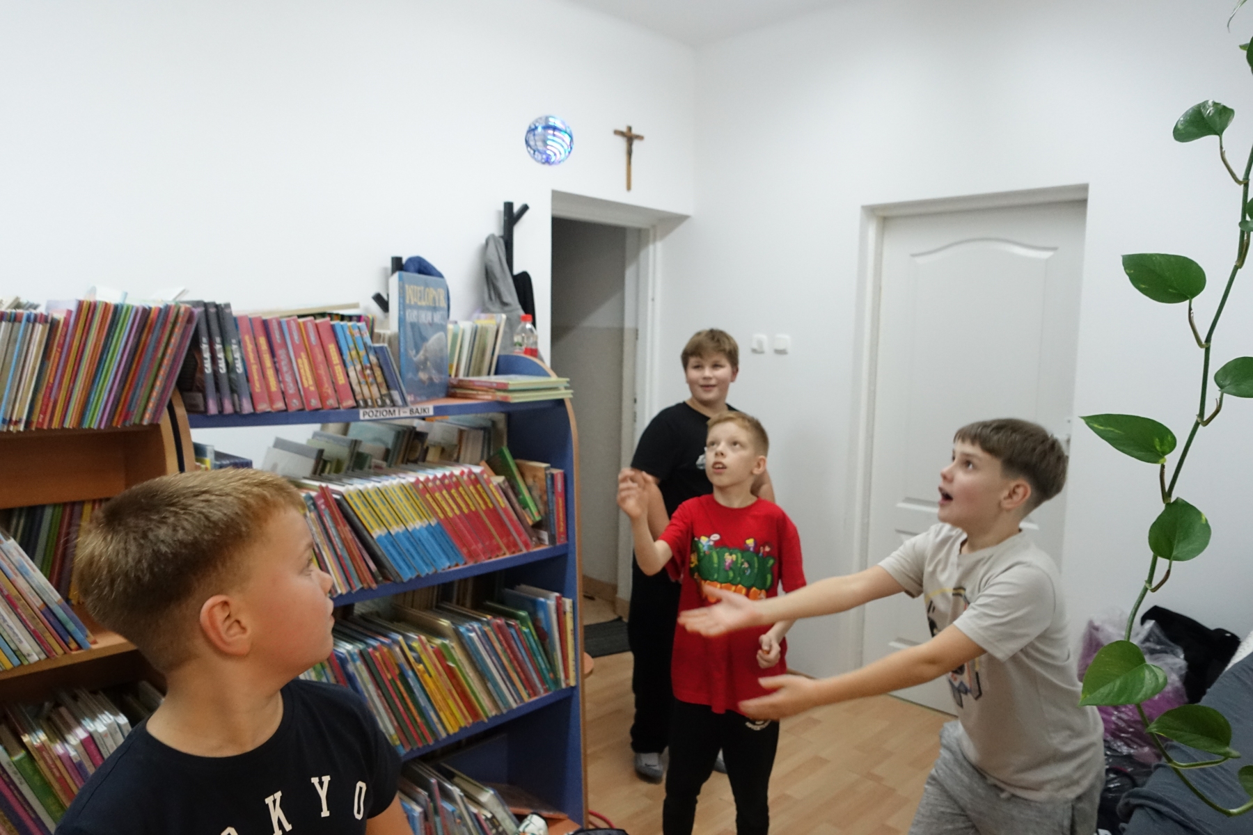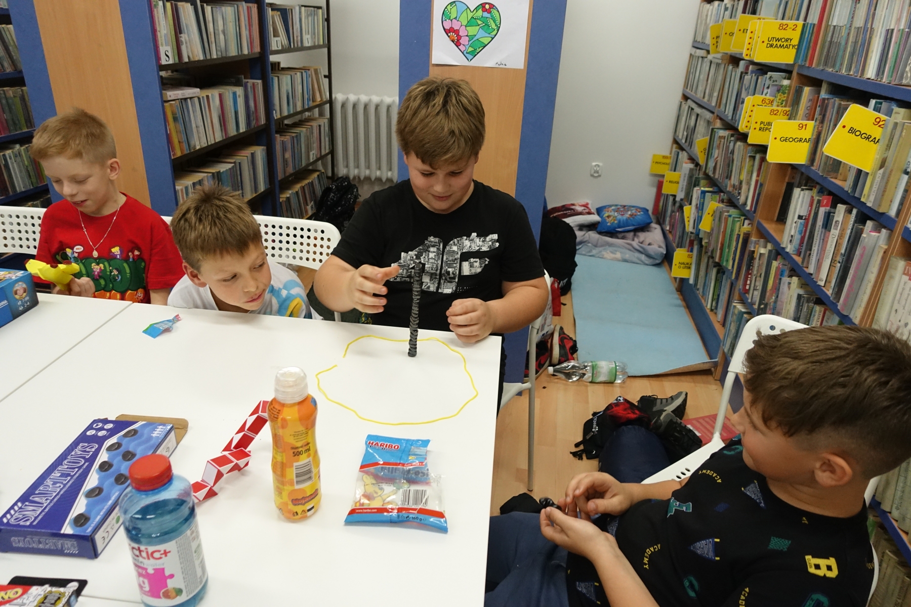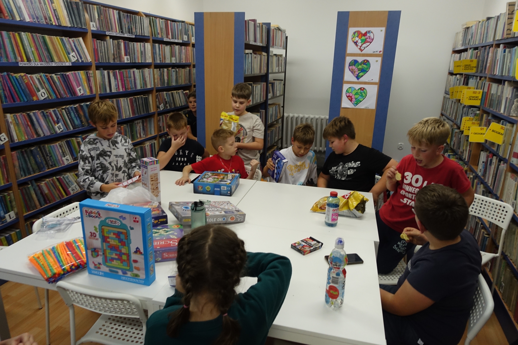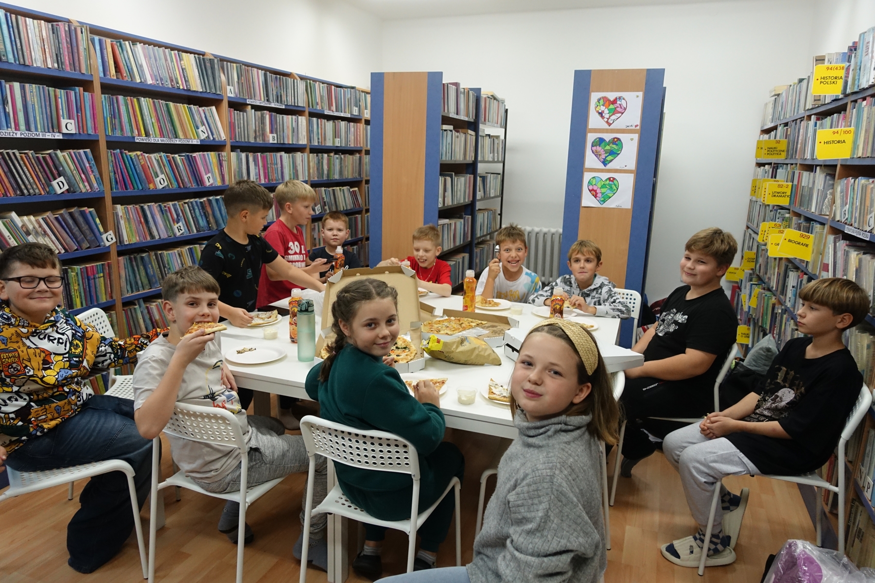 W piątek o godzinie 20.00 rozpoczęliśmy „nocowanie w bibliotece”. Dzieciaki zjadły pizzę, rozmawiały. Było bardzo wesoło. Po kolacji był czas na gry i zabawy nie tylko „stolikowe”, ale i ruchowe – ponieważ grupa okazała się bardzo energiczna. Późnym wieczorem odbył się seans filmowy. Oglądaliśmy film pt. „Biuro Detektywistyczne Lassego i Mai. Rabuś z pociągu”. Po seansie dzieciaki nadal rozmawiały, wymyślały różne zabawy do późnej nocy. Był to bardzo mile spędzony czas, a noc pełna wrażeń.