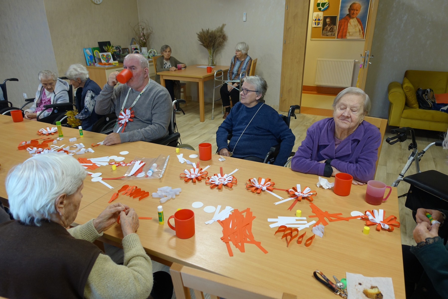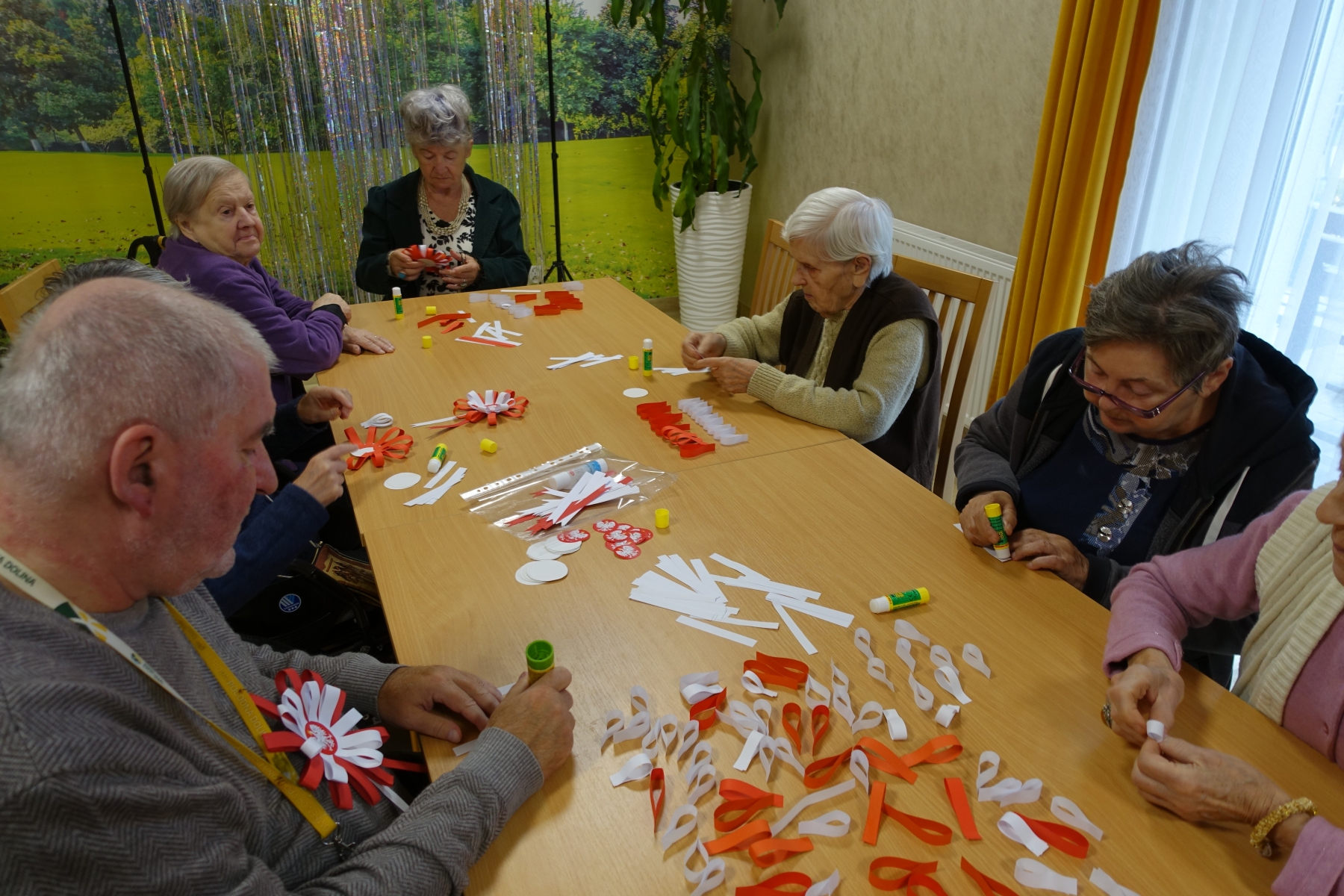 Narodowe Święto Niepodległości –święto państwowe w Polsce obchodzone corocznie 11 listopada dla upamiętnienia odzyskania niepodległości przez Polskę w 1918, po 123 latach zaborów. W związku z tym, dzisiejsze spotkanie poświęciliśmy na pogadankę patriotyczną. Podczas niej Seniorzy opowiadali o swoich wspomnieniach z rożnych sposobów walki o niepodległość Ojczyzny. Pensjonariusze wysłuchali informacji odnośnie tego jakże ważnego dla Polski święta, czytali wiersze patriotyczne, zaśpiewali „Rotę” – M. Konopnickiej, a na zakończenie spotkania wykonali piękne kotyliony. Czas umilały rozmowy oraz nastrojowa muzyka.