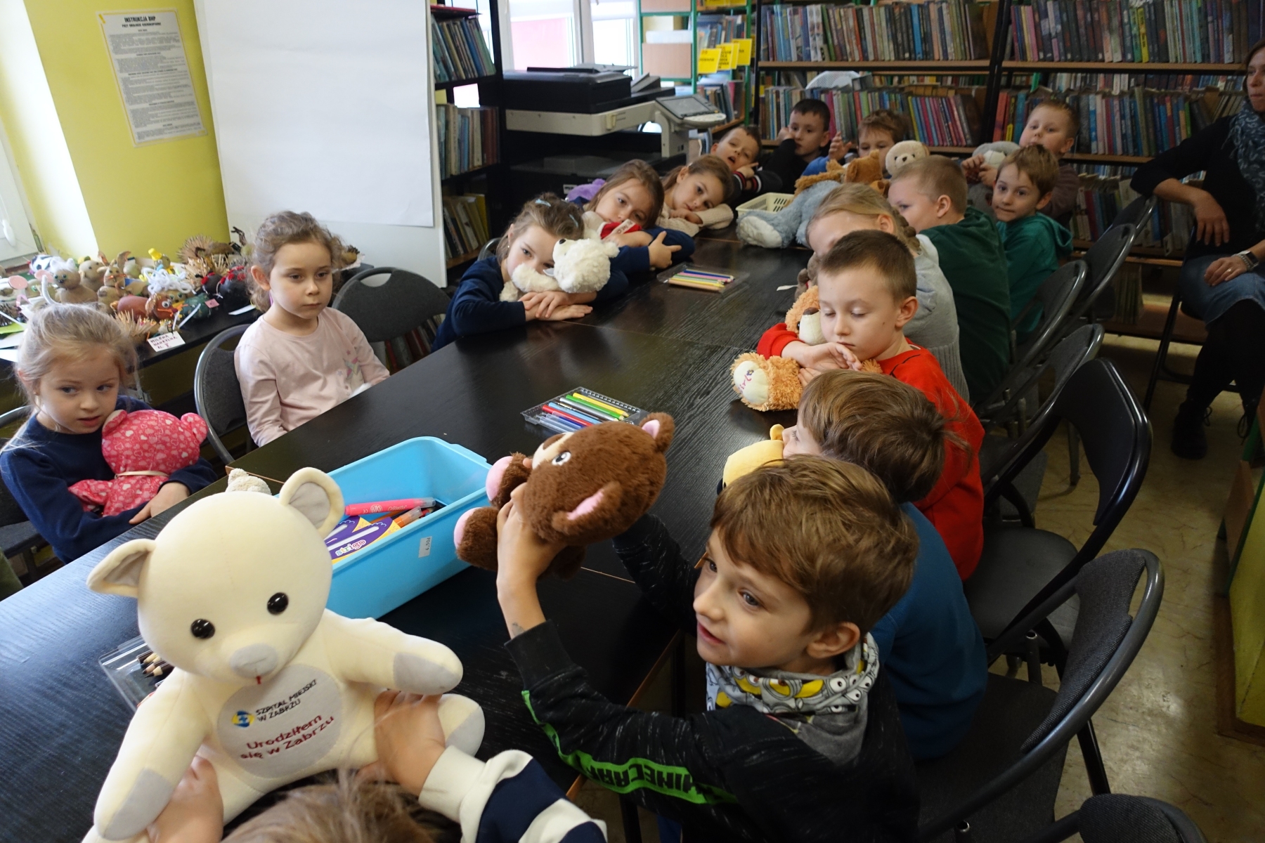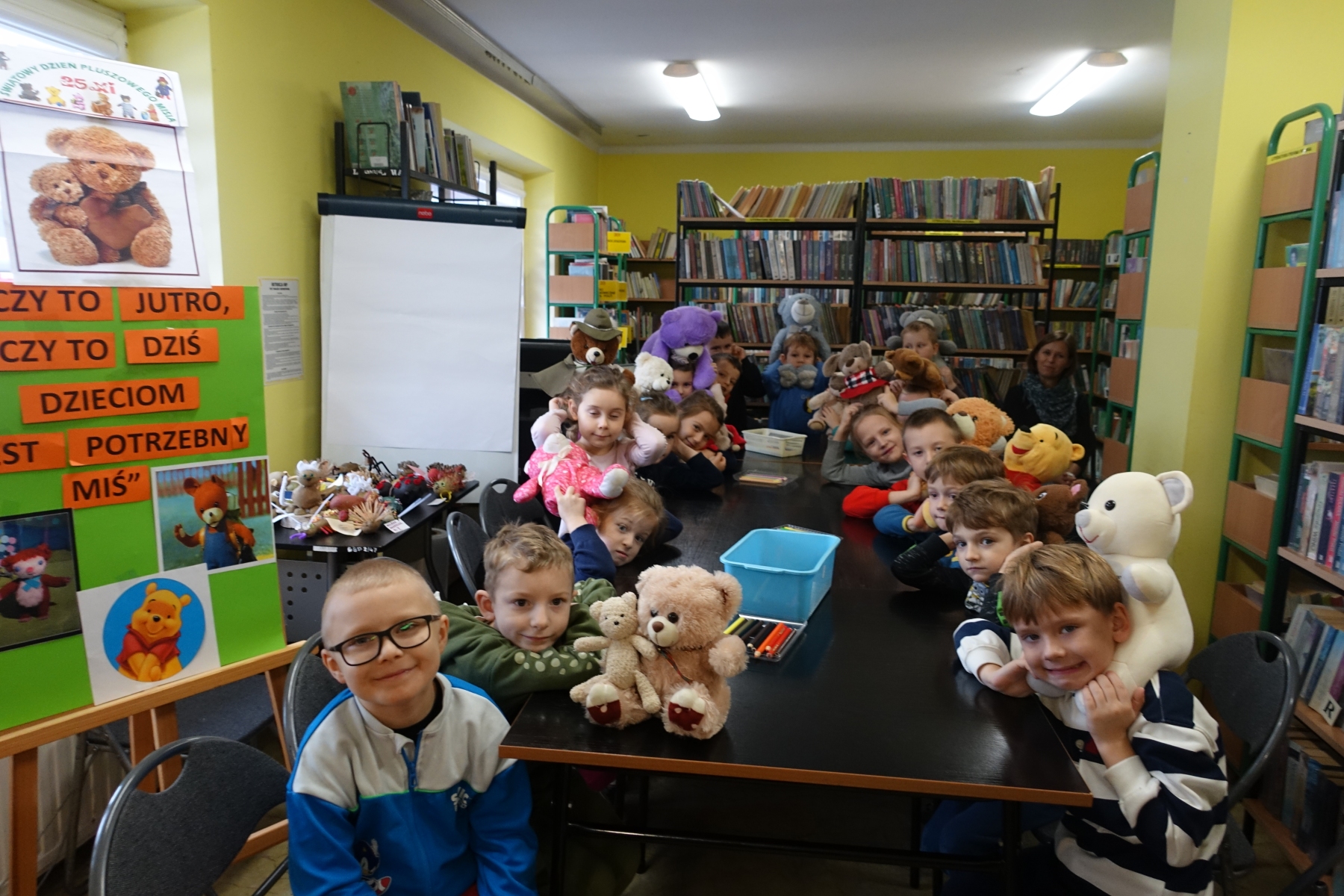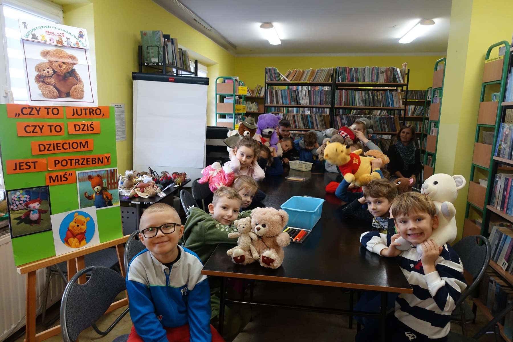 W bibliotece zrobiło się ty razem wesoło, kolorowo i „misiowo”. Biblioteka zamieniła się w magiczną krainę pełną uśmiechu i radości, ponieważ odbył się tu Dzień Pluszowego Misia. Mimo coraz nowocześniejszych i atrakcyjniejszych zabawek, moda na misie nie przemija. Tego dnia każde dziecko przyniosło ze sobą misia. Można było zobaczyć misie małe, średnie, duże, brązowe, różowe, białe itd. Wszystkie były śliczne i wyjątkowe. Pluszowy miś to najlepszy przyjaciel każdego dziecka, ukochana maskotka na dobre i złe chwile. Można go przytulić i powierzyć mu swoje radości i smutki. Dzieciaki wymieniały za co kochają misie?, jakie misie znają z bajek lub książek?. Układały puzzle z wizerunkami misia, a książeczki zawierające w swojej treści misie były z dużym zainteresowaniem oglądane. Wysłuchały też krótkich opowiadań i wierszy o misiach. To niezwykłe wydarzenie było okazją do wspólnej zabawy.