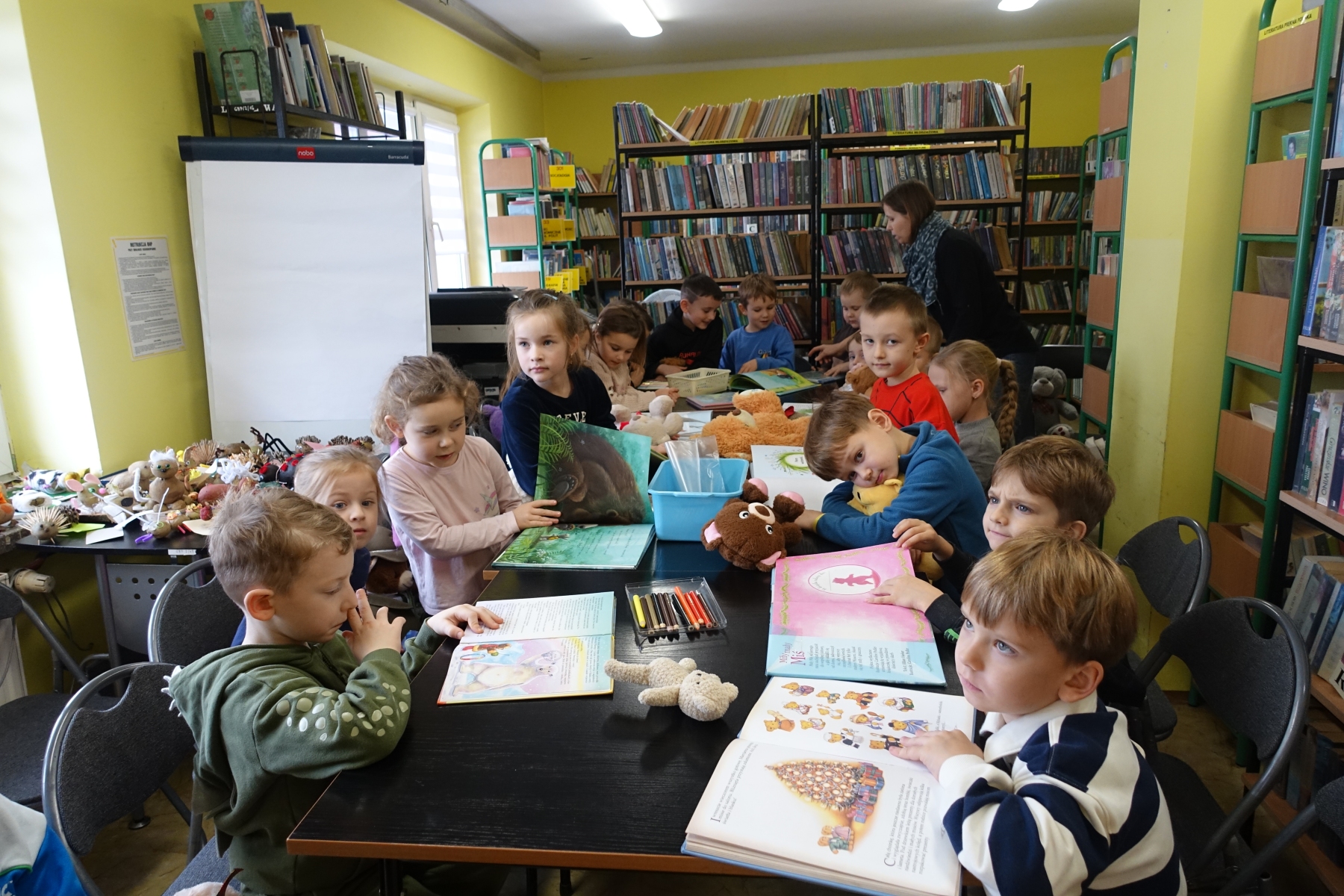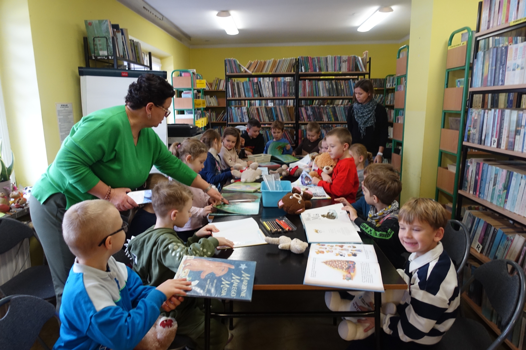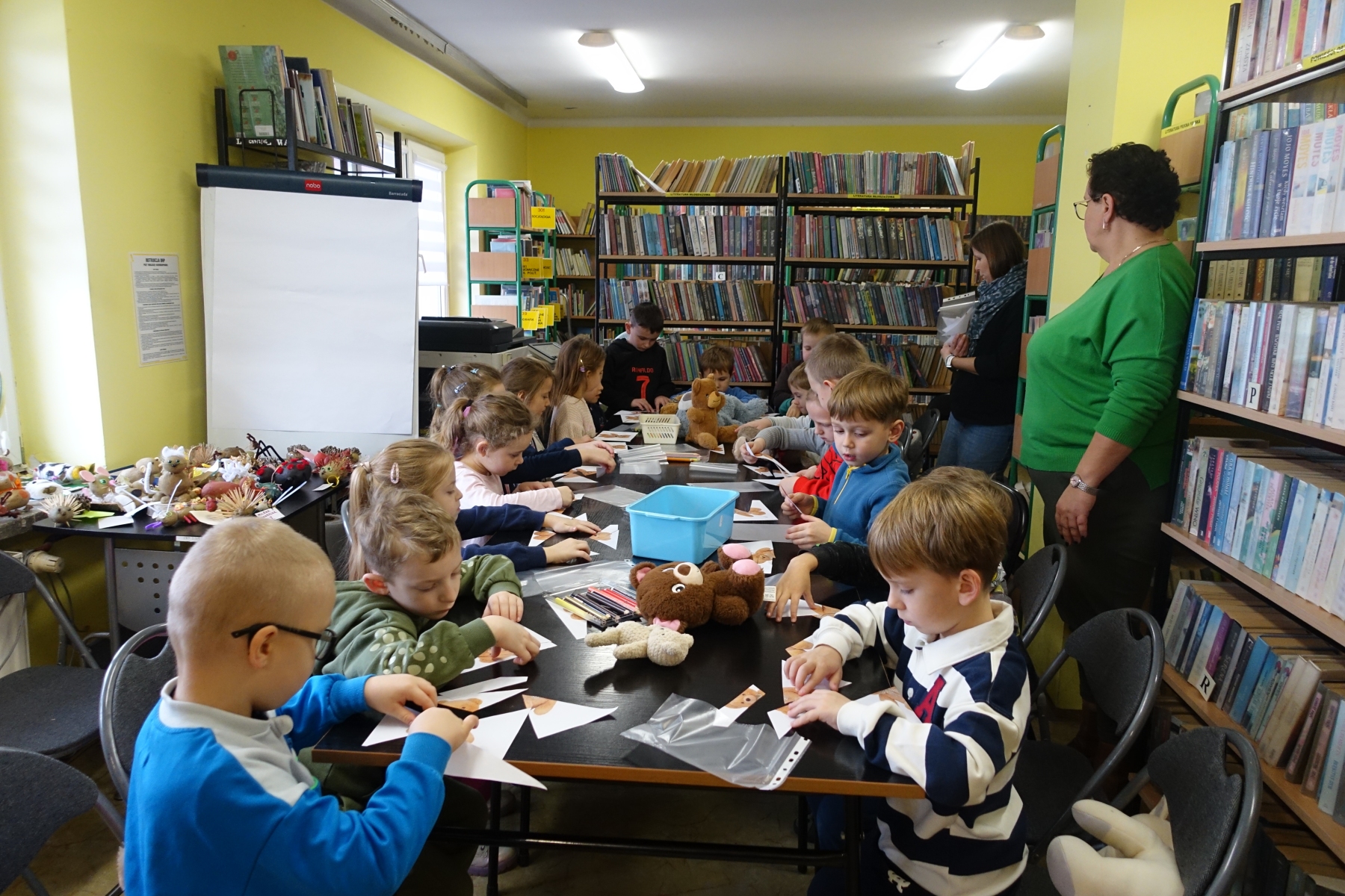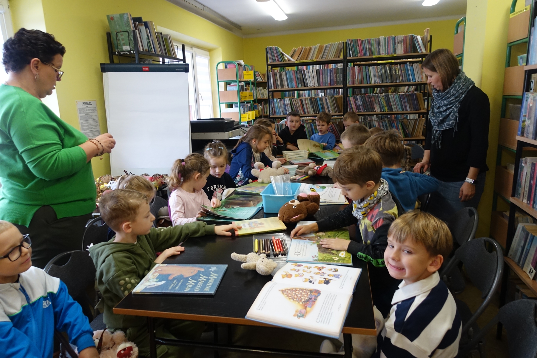 W bibliotece zrobiło się ty razem wesoło, kolorowo i „misiowo”. Biblioteka zamieniła się w magiczną krainę pełną uśmiechu i radości, ponieważ odbył się tu Dzień Pluszowego Misia. Mimo coraz nowocześniejszych i atrakcyjniejszych zabawek, moda na misie nie przemija. Tego dnia każde dziecko przyniosło ze sobą misia. Można było zobaczyć misie małe, średnie, duże, brązowe, różowe, białe itd. Wszystkie były śliczne i wyjątkowe. Pluszowy miś to najlepszy przyjaciel każdego dziecka, ukochana maskotka na dobre i złe chwile. Można go przytulić i powierzyć mu swoje radości i smutki. Dzieciaki wymieniały za co kochają misie?, jakie misie znają z bajek lub książek?. Układały puzzle z wizerunkami misia, a książeczki zawierające w swojej treści misie były z dużym zainteresowaniem oglądane. Wysłuchały też krótkich opowiadań i wierszy o misiach. To niezwykłe wydarzenie było okazją do wspólnej zabawy.