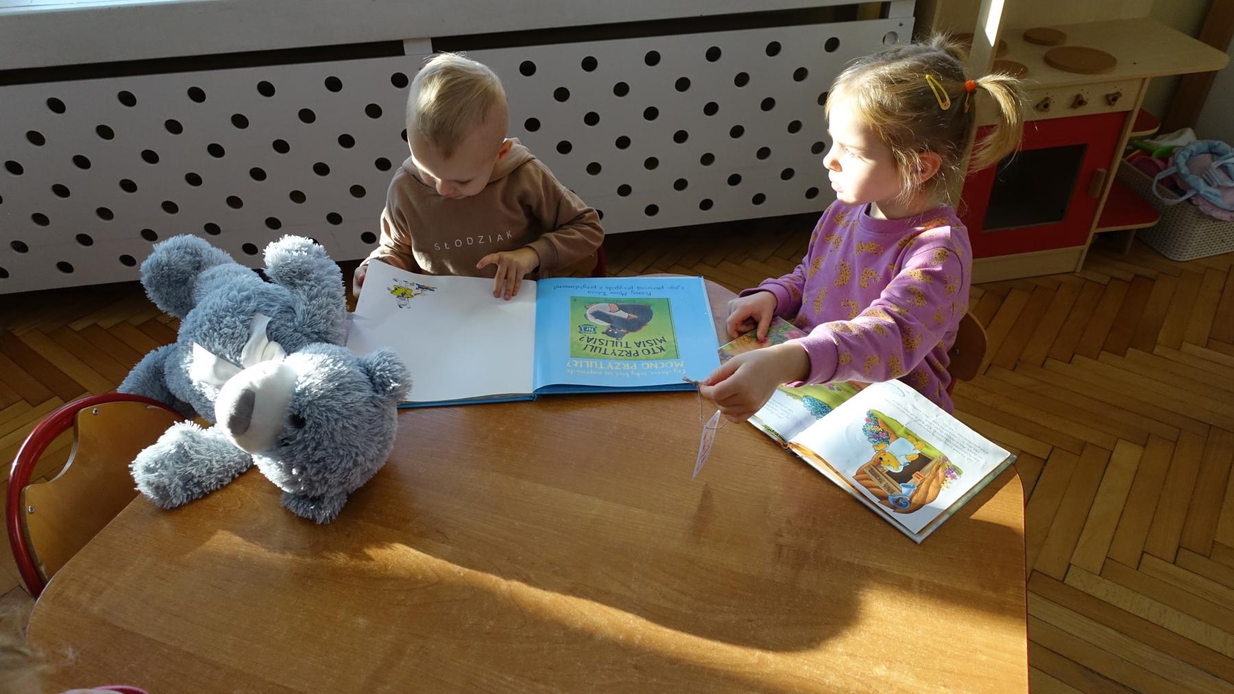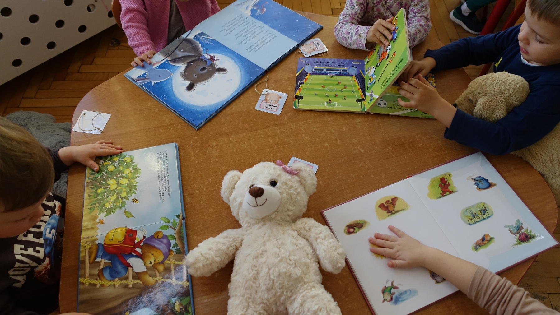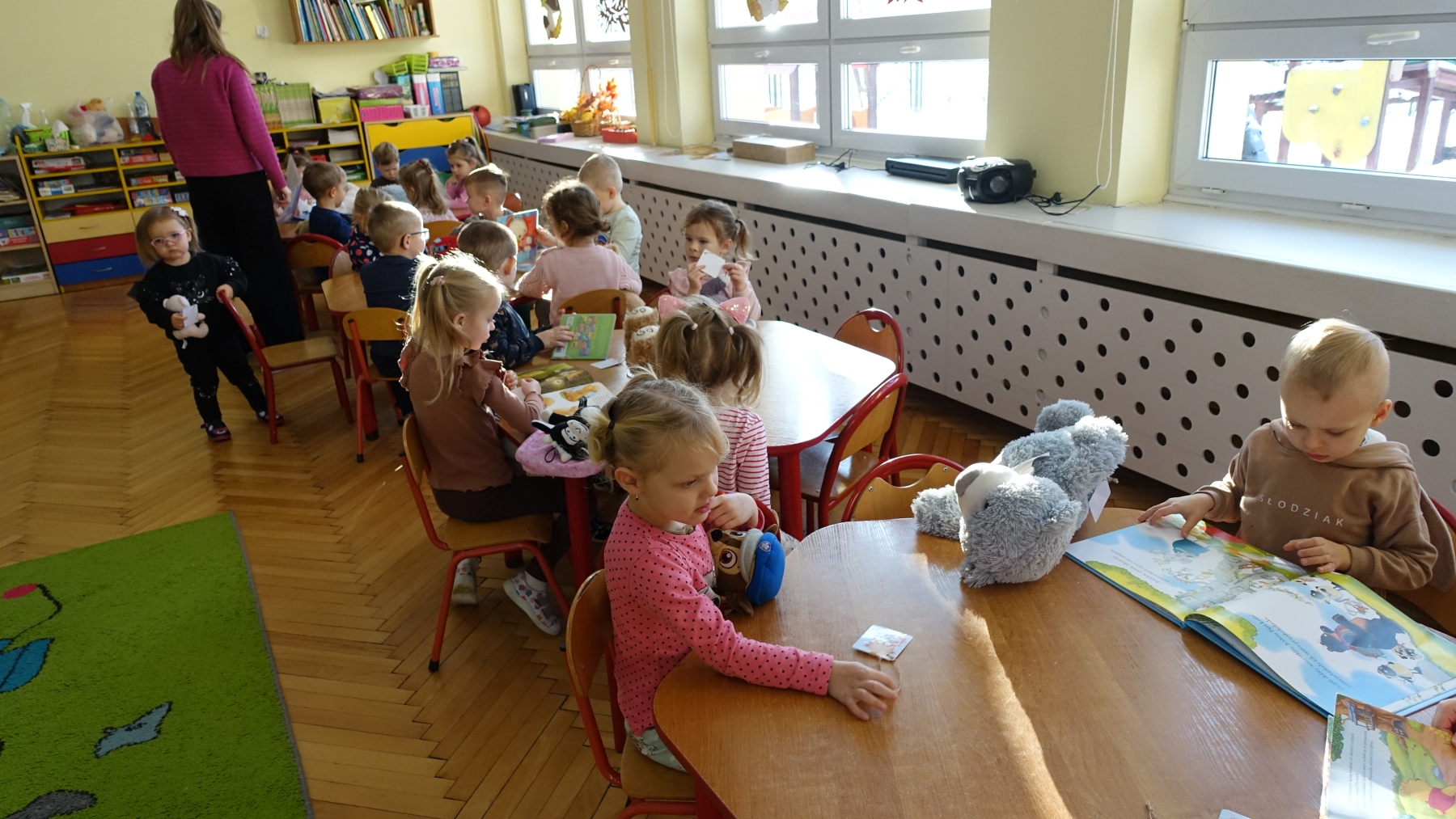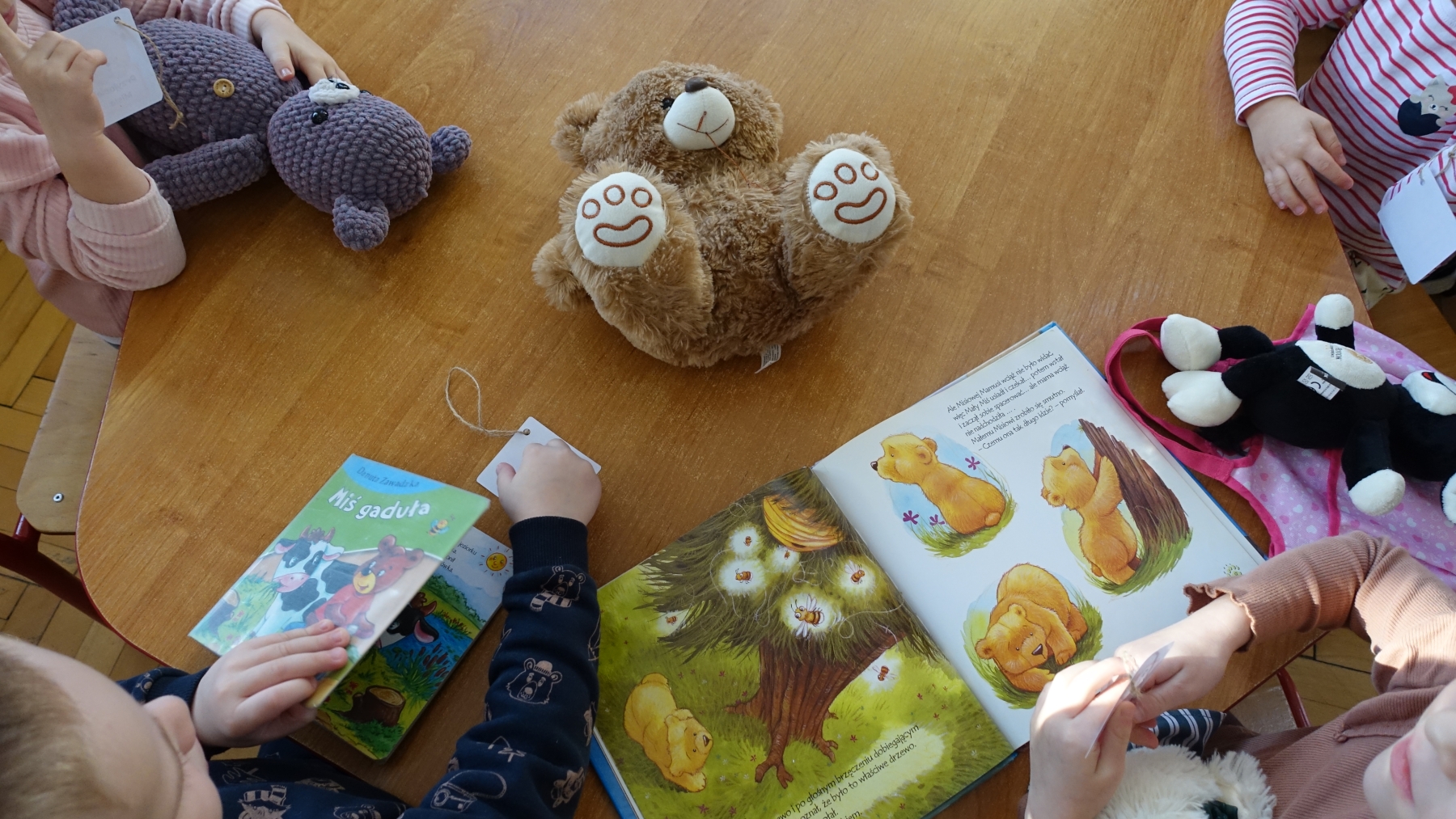 . Mówiły, że misie są do przytulania, pomagają zasypiać i dają poczucie bezpieczeństwa. Podkreśliły także, że nie wolno ich niszczyć, ponieważ są dla nas ważne i ktoś musiał je uszyć, więc warto doceniać pracę innych.Dzieci dowiedziały się również, że misie występują w wielu bajkach. Pani bibliotekarka zaprezentowała im kilka tytułów i pokazała, jak różne mogą być książkowe pluszaki . Razem wspominaliśmy też naszego polskiego bohatera – Misia Uszatka. Przedszkolaki z radością odsłuchały czołówkę bajki